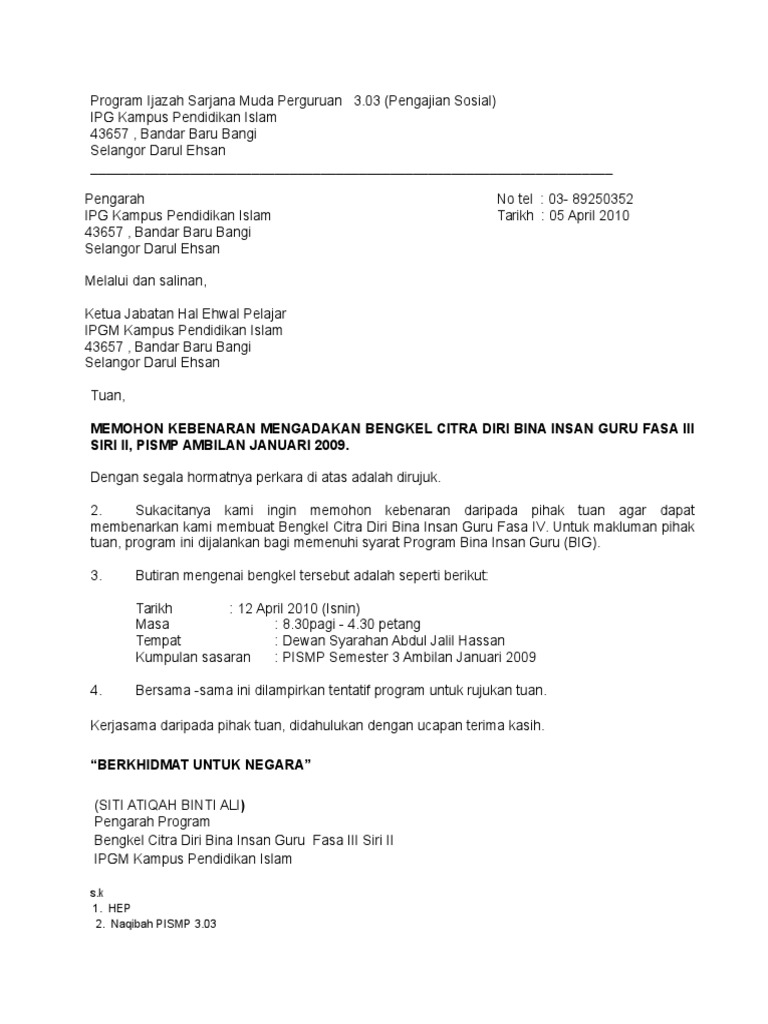 Contoh Surat Memohon Kebenaran Mengadakan Big Kepada Pengarah Pdf